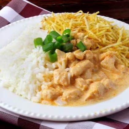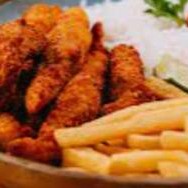 Isca de peito de frango temperadas e fritas, finalizadas com molho especial acompanha arroz branco e batata palha. ( os acompanhamentos não se trocam )
