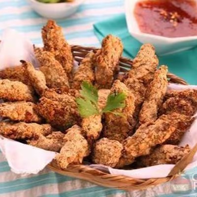 Isca de carne, temperadas, frita e complementos.Foto Meramente Ilustrativa.