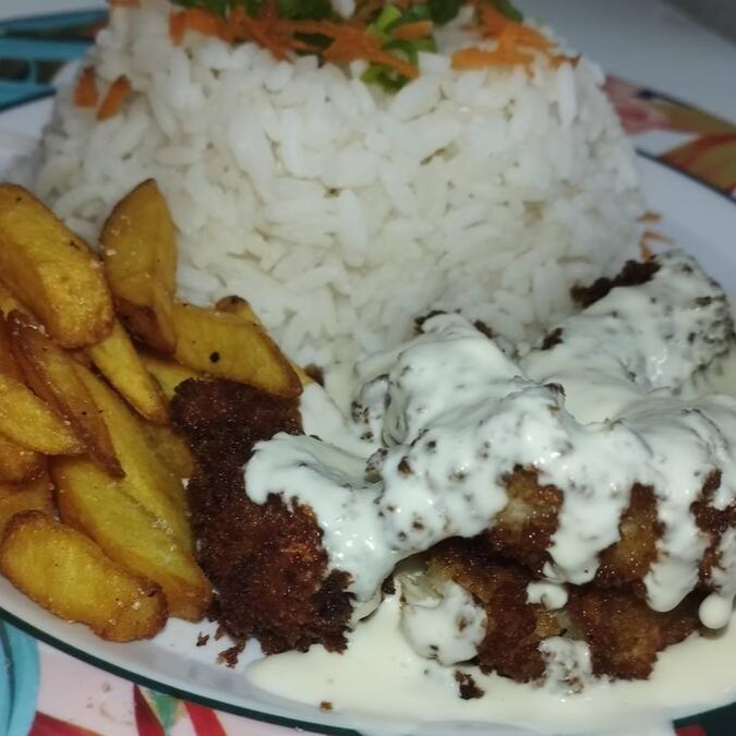 Frango empanado no panko ao molho branco, mais complementos.Foto Meramente Ilustrativa