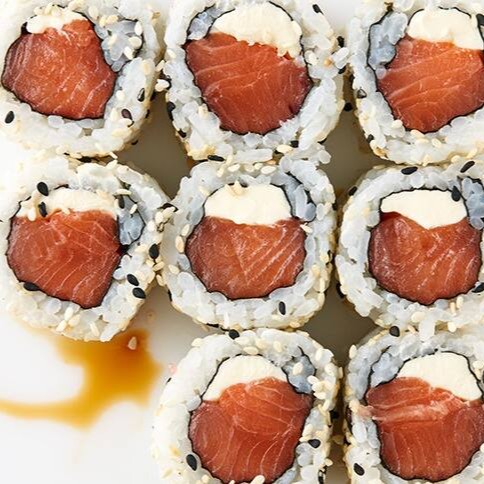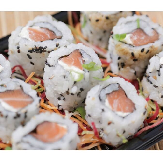 Enrolado De Arroz Revestido Com Nori, Com Recheio por cima, Cream Cheese e Salmão.