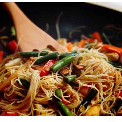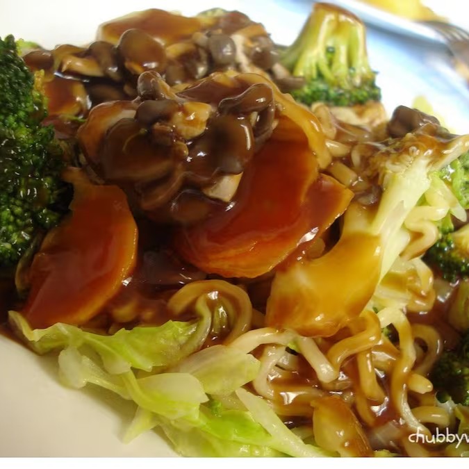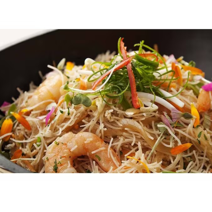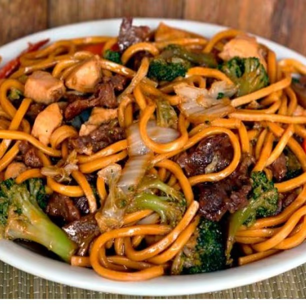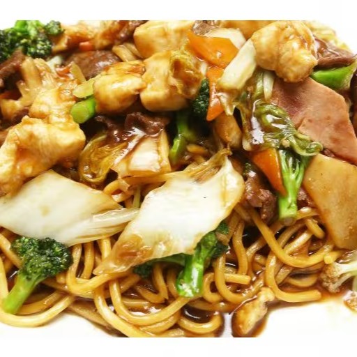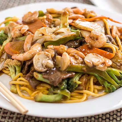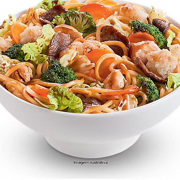 Legumes, carne, frango, camarão e macarrão ao molho shoyo