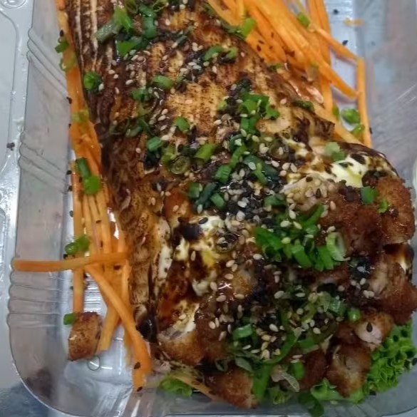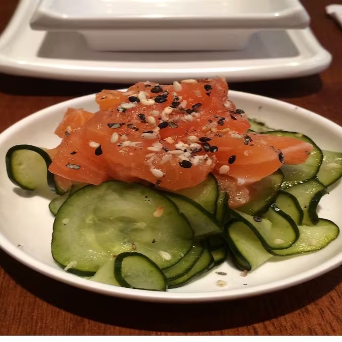 Desfrute do nosso 'Sunomono de Salmão', uma delicada e refrescante salada da culinária japonesa. É composta por finas fatias de pepino japonês, cuidadosamente conservadas para manter sua crocância inigualável, e luxuosos cubos de salmão, conhecido pela sua textura suave e sabor delicado. Esta combinação perfeita é finalizada com um toque de tempero secreto que eleva o paladar a um novo nível. Uma verdadeira experiência gastronômica!