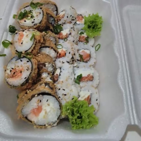 10 uramaki de salmao, 10 uramaki de kane, 10 uramaki de shin, 10 uramaki de camarao empanado,5 unidade de niguiri de salmao, 5 unidade de niguiri de shin,5 unidade de ebi joy, 5 unidade de joy joy,10 unidade de kane queijo ( 5 natural e 5 empanado)