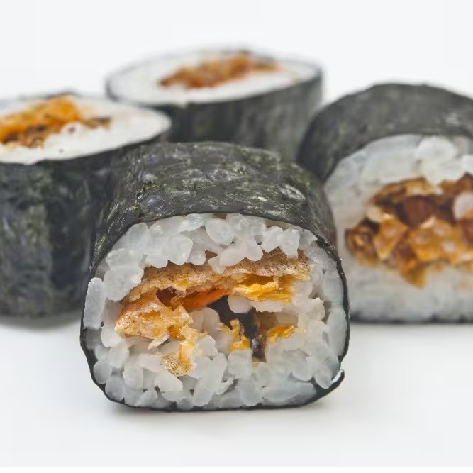 Sushi na massa de harumaki com recheio de arroz e cream cheese.