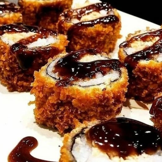 Lâmina de salmão maçaricado envolvida em arroz skin empanado e creme chesse