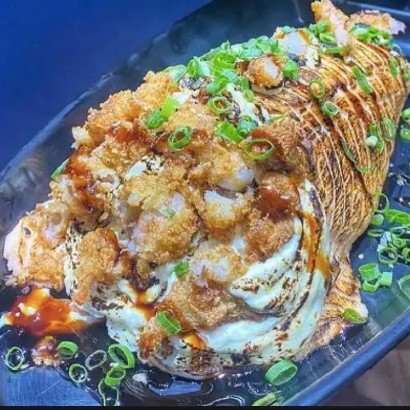 Lâmina de salmão maçaricado envolvida em arroz salmão empanado e creme chesse