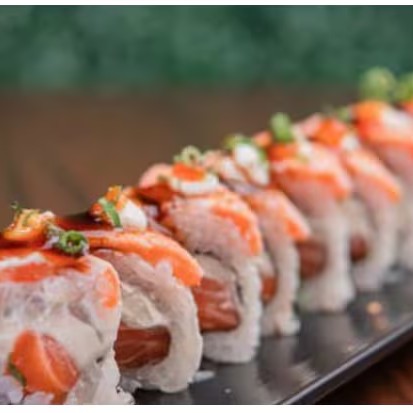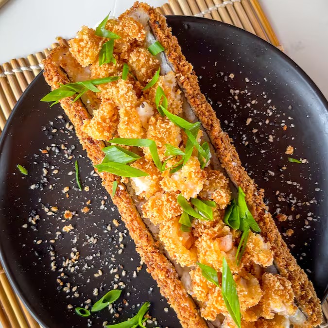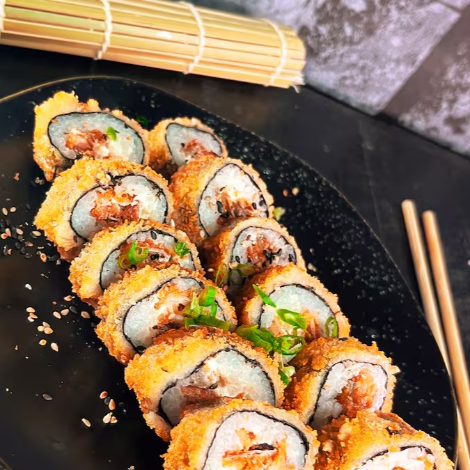Arroz enrolado na massa empanada e crocante, com recheio de kani e cream cheese.