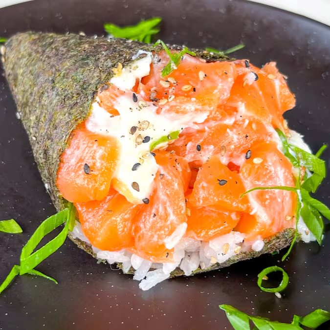 Temaki na alga recheado com arroz, pasta de salmão, cream cheese e cebolinho.