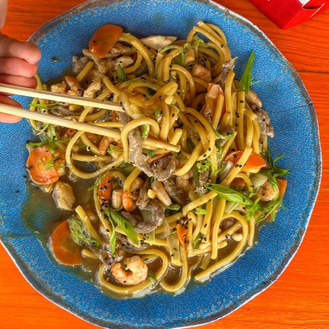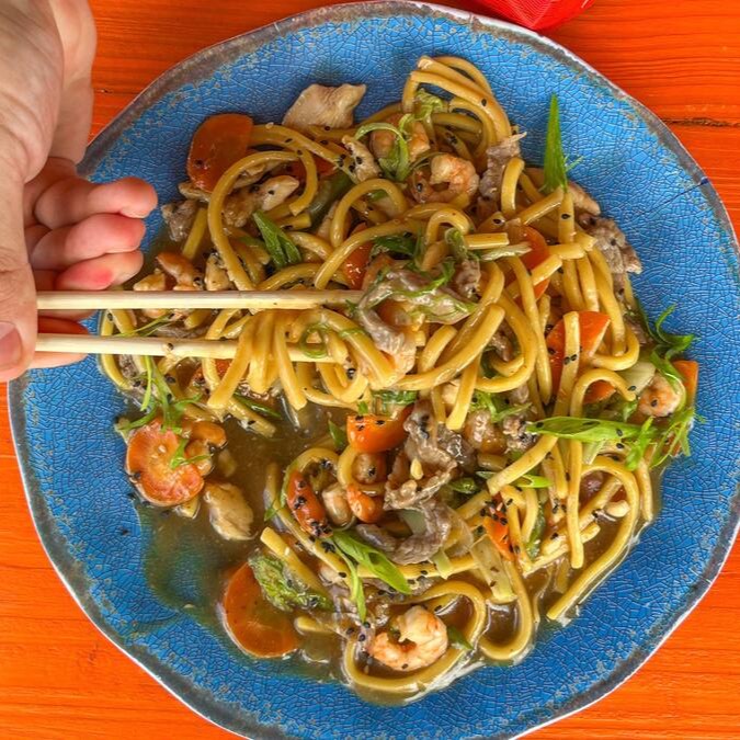 Nosso delicioso bifum com frango, carne, camarões e legumes salteados no molho oriental. Leve, saboroso e irresistível!