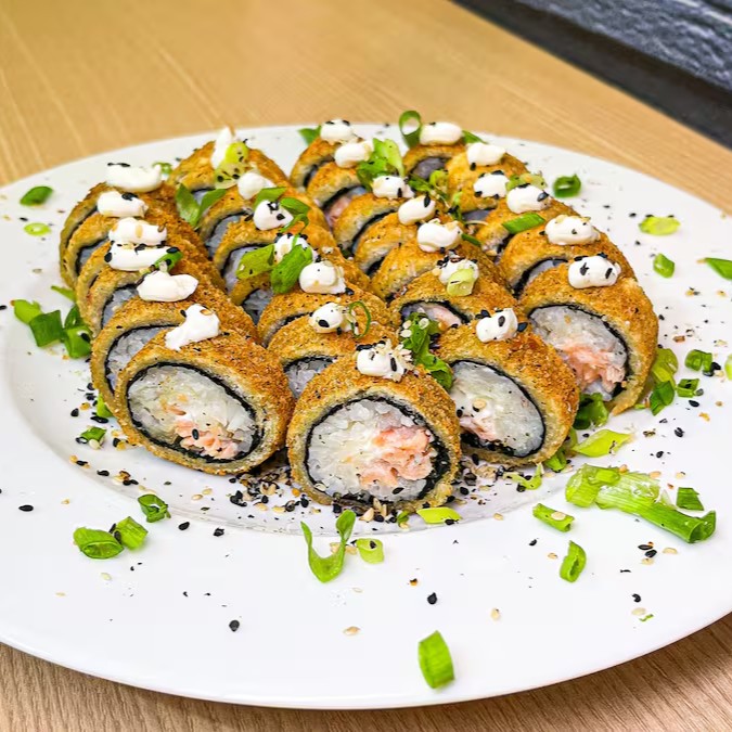 Arroz enrolado na massa empanada e crocante, com recheio de pasta de salmão e cream cheese.