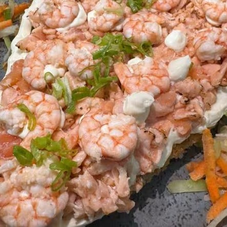 Cubos de salmão, camarão, kani com pepinos marinados no molho agridoce.