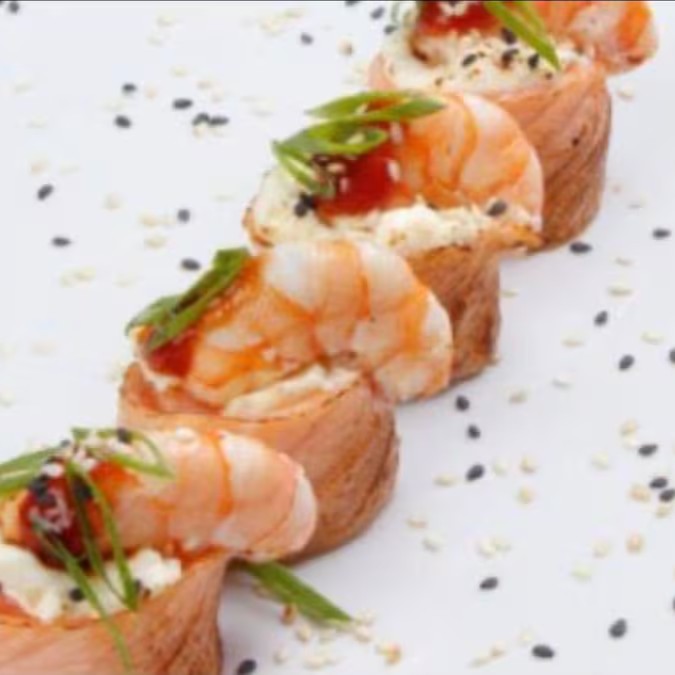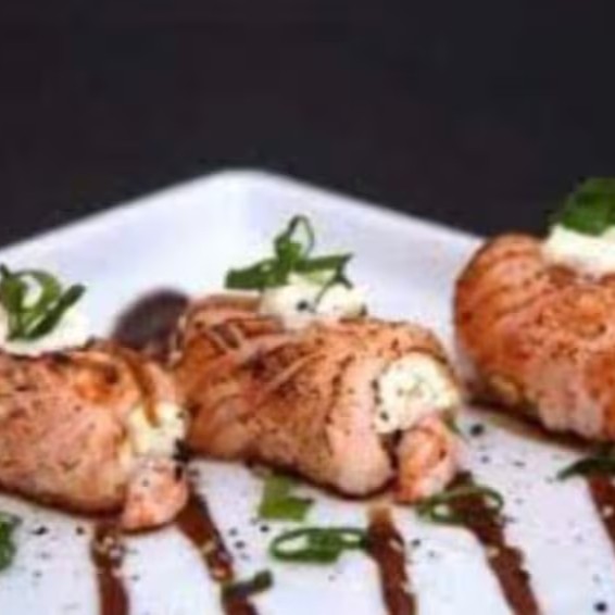 O Melhor Da Culinária Japonesa Na Sua Casa, Aproveite! Acompanha 4 unidades - Lâmina de salmão recheado com camarão e cream cheese.