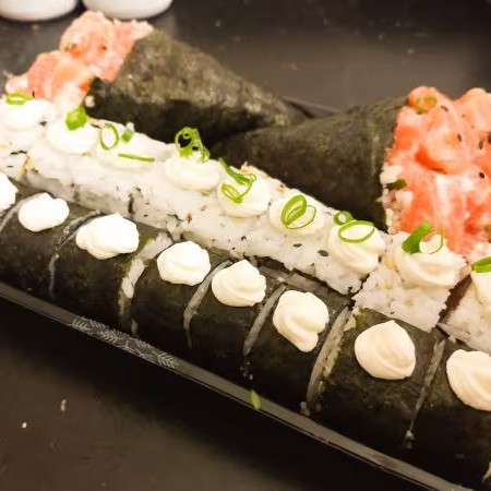 O Melhor Da Culinária Japonesa Na Sua Casa, Aproveite! Acompanha Arroz, salmão e cream cheese envolvidos no nori (folha de algas marinhas) empanado e frito com camarão extra. (10 peças) Acompanha hashi, sachê shoyu e teriaky