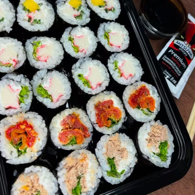 10 hosso de skin, 5 hosso de camarão, 10 hosso de kani , 5 hosso de pasta especial. Acompanha molhos, gergilim e cebolinho.