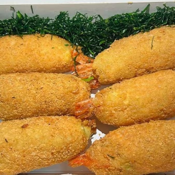 Camarão recheado com cream cheese, enrolado e frito.