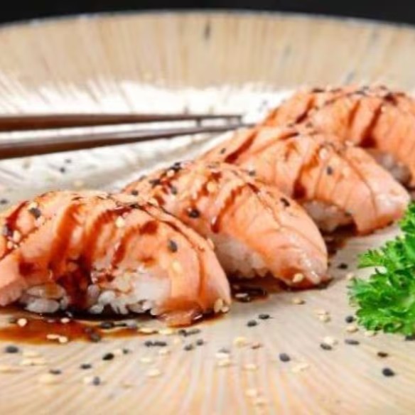 O Melhor Da Culinária Japonesa Na Sua Casa, Aproveite! Acompanha Lâmina natural de salmão sobre o arroz prensado, finalizado com cebolinha.