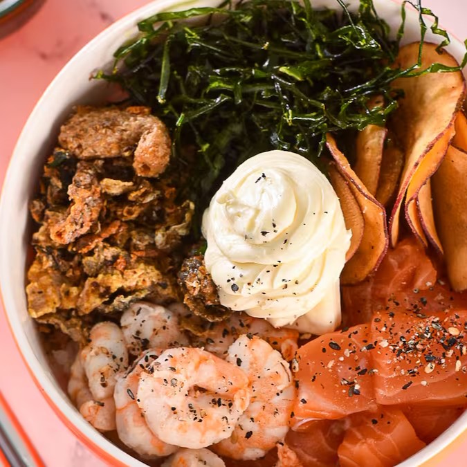 Salmão em lâminas, arroz, camarão frito