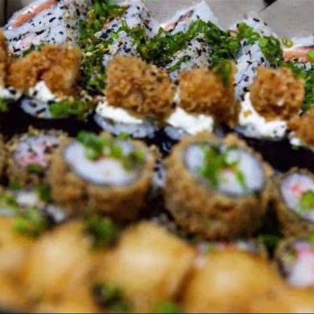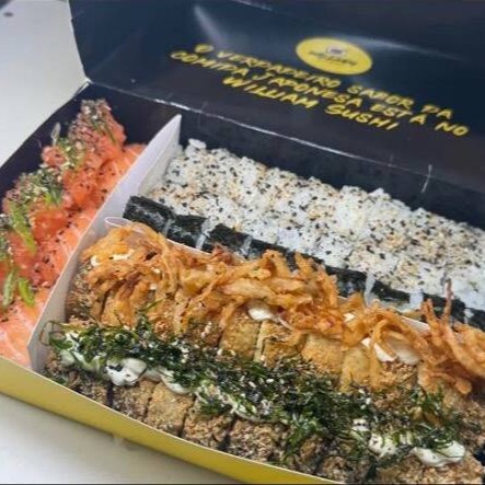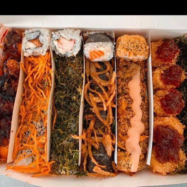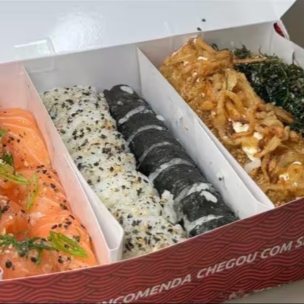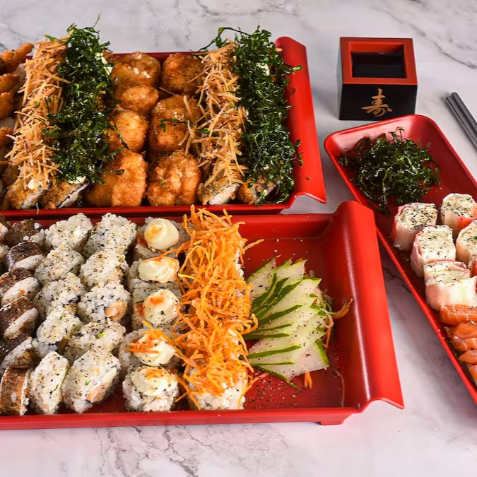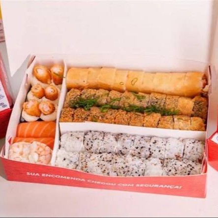 40 peças: 10 cariocas de salmão 10 hot rolls de S c/ couve 5 canepes de camarão empanado 5 canepes de salmão 5 Uramakis especial de chips c/cenoura 5 kani cheese empanados