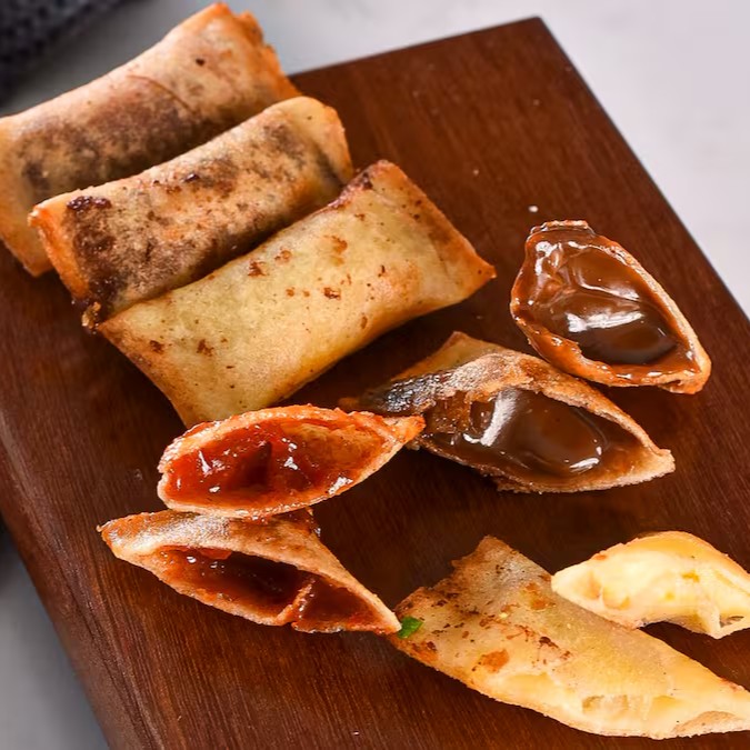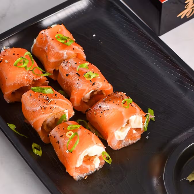 Salmão, cream cheese, nori com arroz, enrolado na massa de pastel japônes.