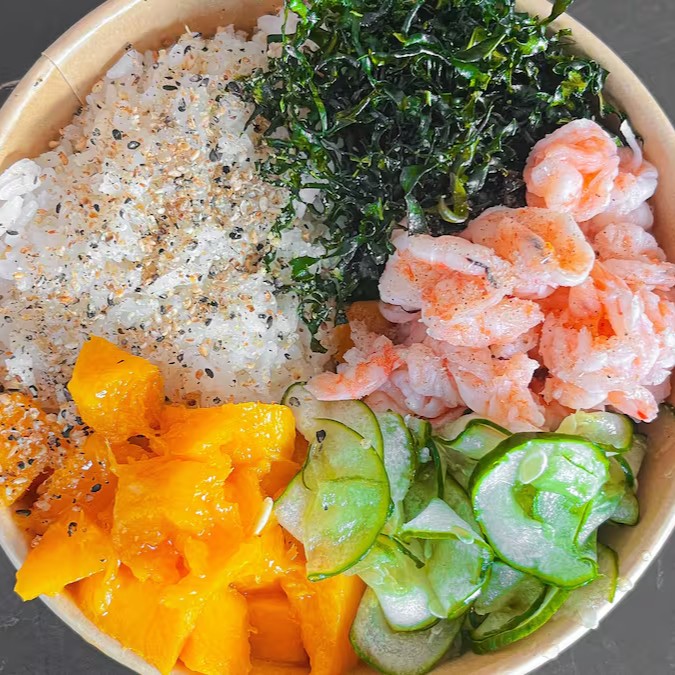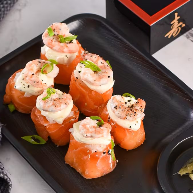 Salmão em lâminas, arroz, camarão cozido e cream cheese.
