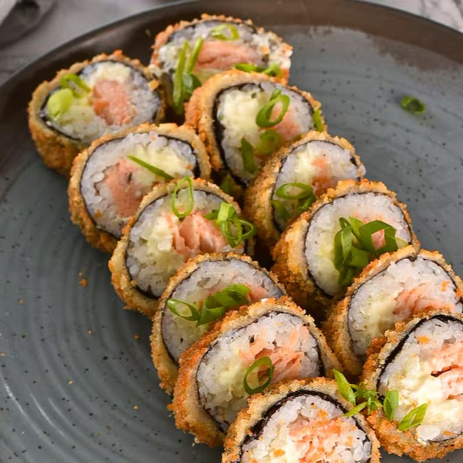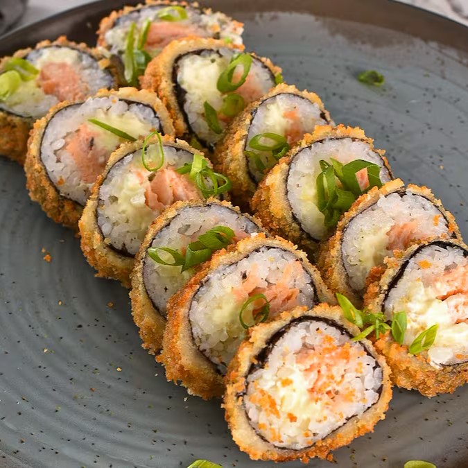 Salmão, cream cheese, nori com arroz, empanado e frito.