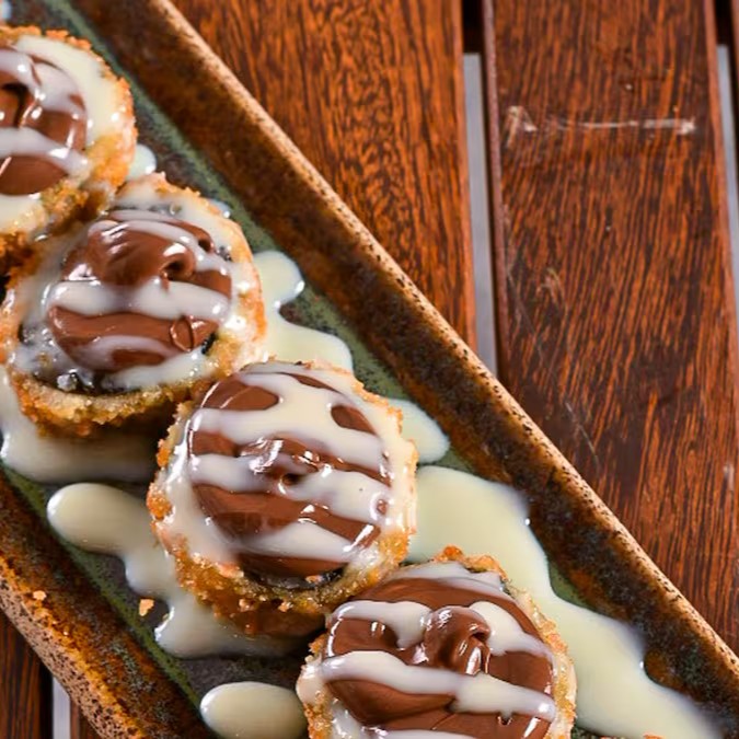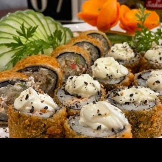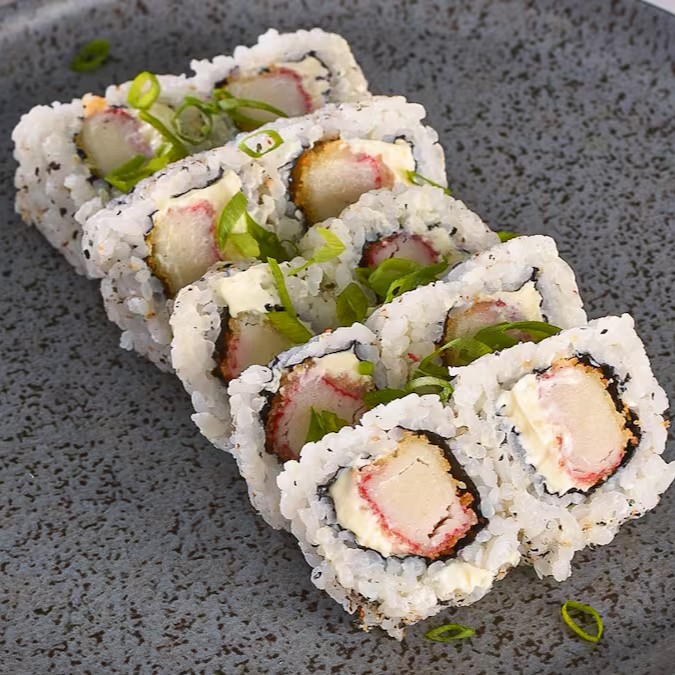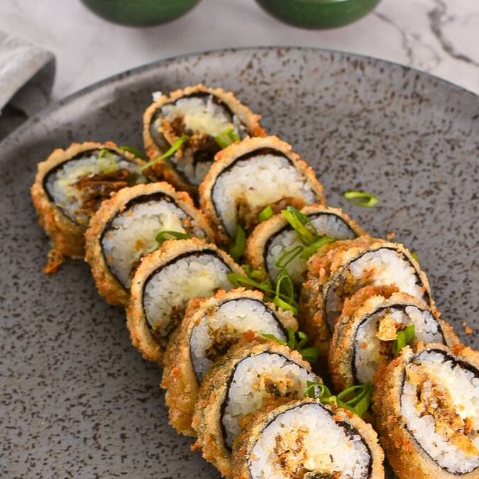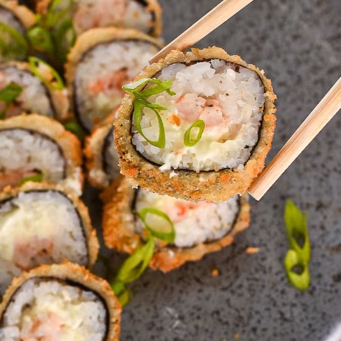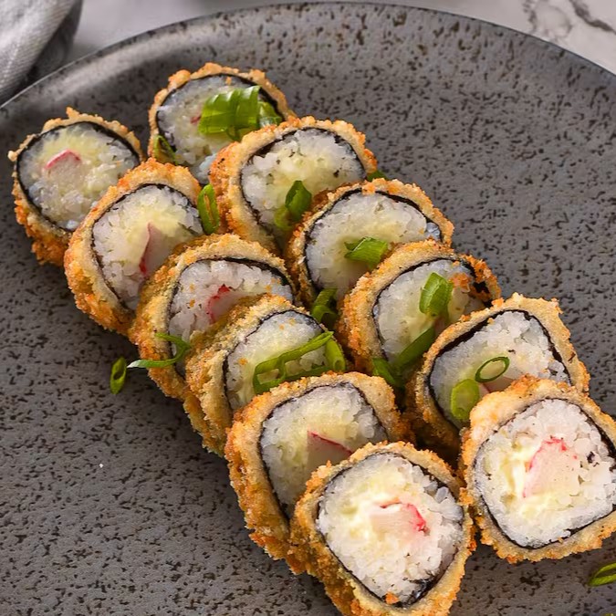 Kani, cream cheese, nori com arroz, empanado e frito.