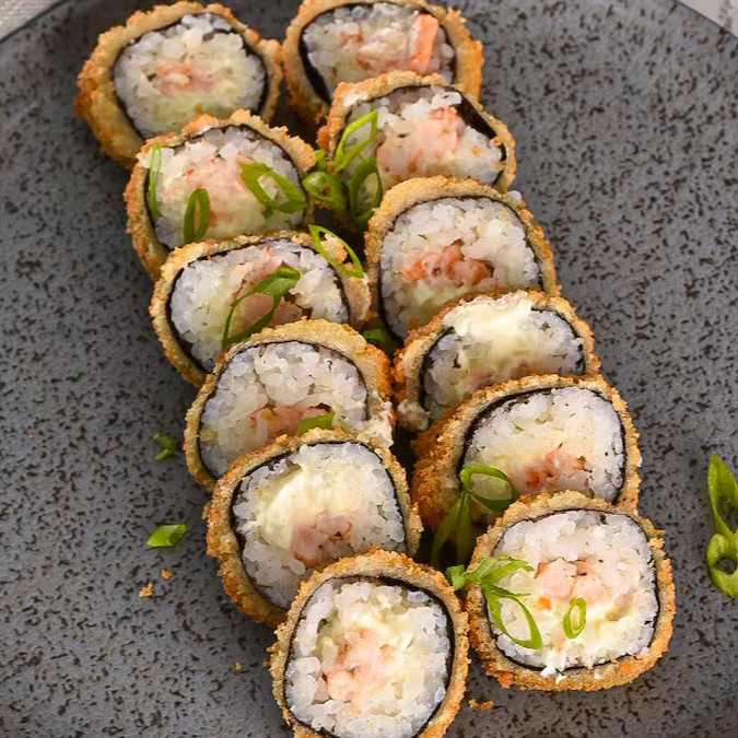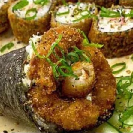 Camarão frito, cream cheese, nori com arroz, empanado e frito.