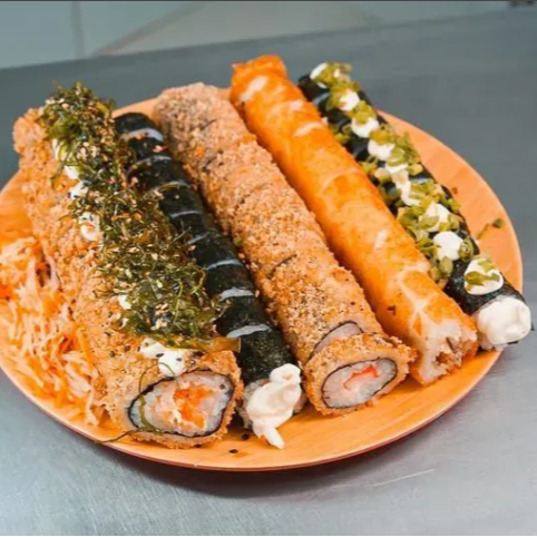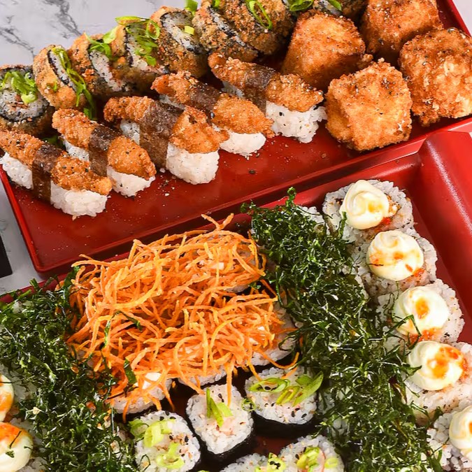53 Peças: 12 hots de salmão, 10 uramaki de camarão frito com crispy de couve folha, 04 kani cheese frito, 06 shakemaki, 05 niguiri de camarão frito, 06 hossomaki com cream cheese e crispy de cenoura, 10 uramakis de skin com cream cheese e molho de pimenta.
