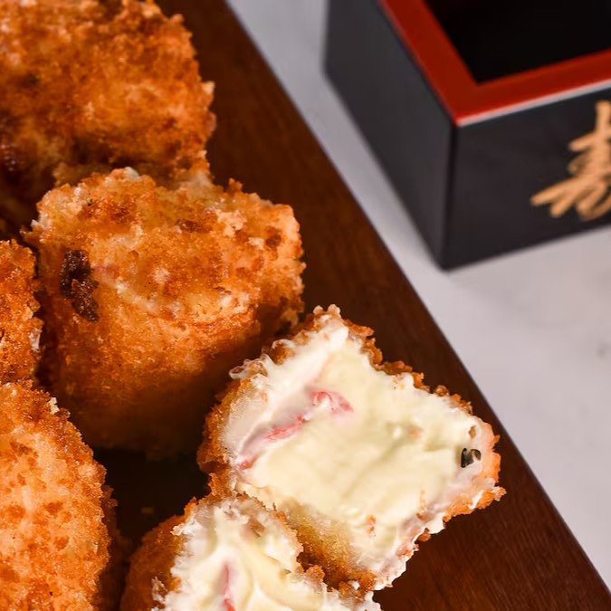 Kani, cream cheese, empanado e frito.