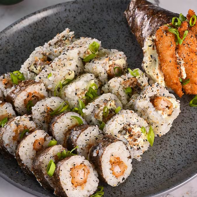 01 temaki de camarão frito, 10 uramakis de camarão frito e 12 hossomakis de camarão frito