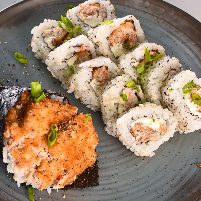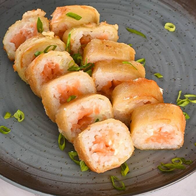 10 uramakis de pasta de salmão frita