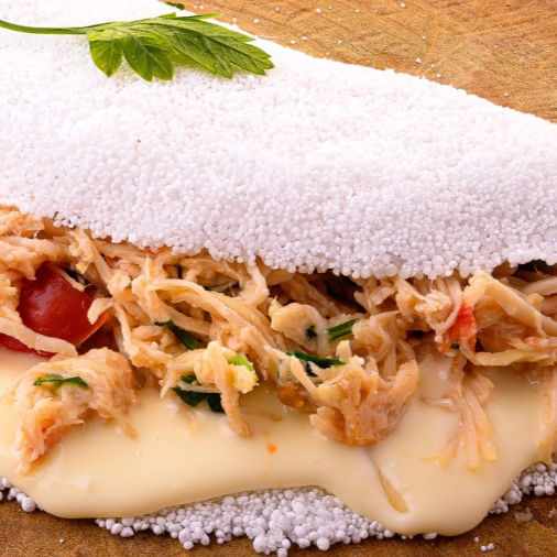 Tapioca De Frango Com Queijo Coalho Ao Molho De Bacon