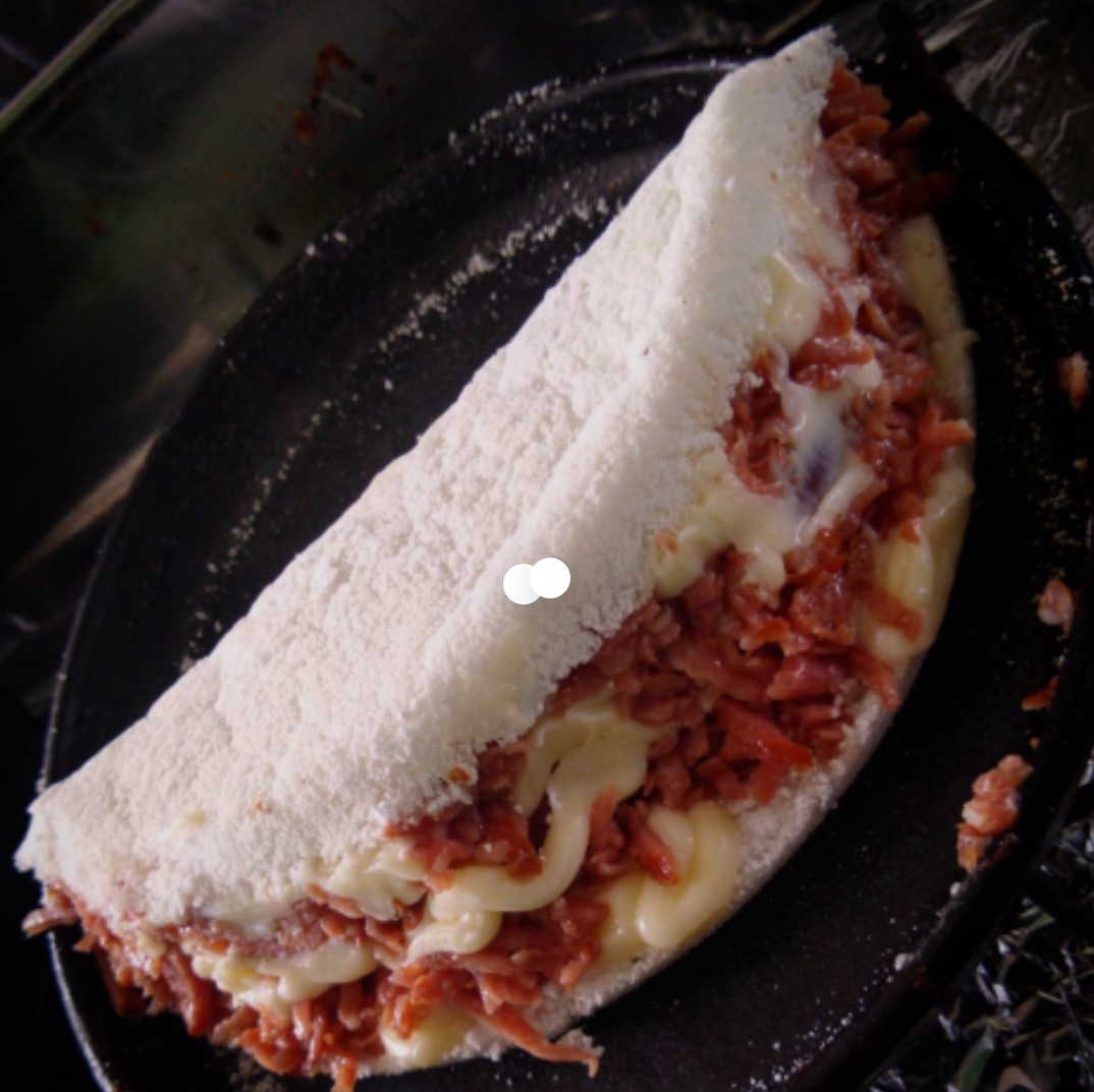 2 Massas de tapioca abertas, 3 Sabores de sua preferência, ovos, Creme cheese ou cheddar e bacon