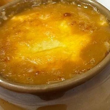 Lascas de bacalhau, cebolas e camada fina de maionese gratinada.