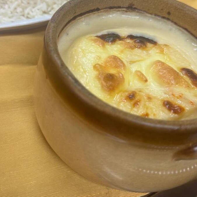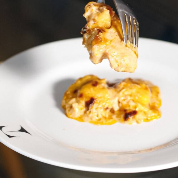 Lascas de bacalhau ao creme, gratinadas com queijo.