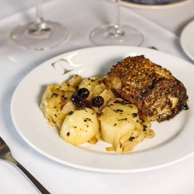 Posta alta de bacalhau polvilhada com alho cebolas, batatas, azeitonas portuguesas, salsa, azeite ao forno.