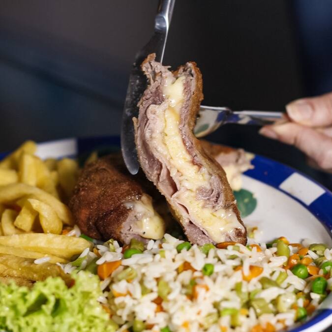 Filé alto recheado com presunto e queijo mussarela, acompanha fritas e arroz a grega.