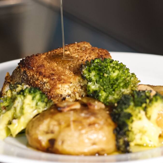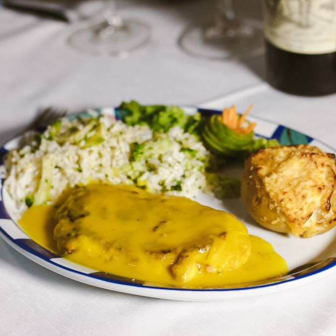 Grelhado com suave creme de laranja e ervas finas, acompanha arroz de brócolis, batata recheada com queijo ao forno.