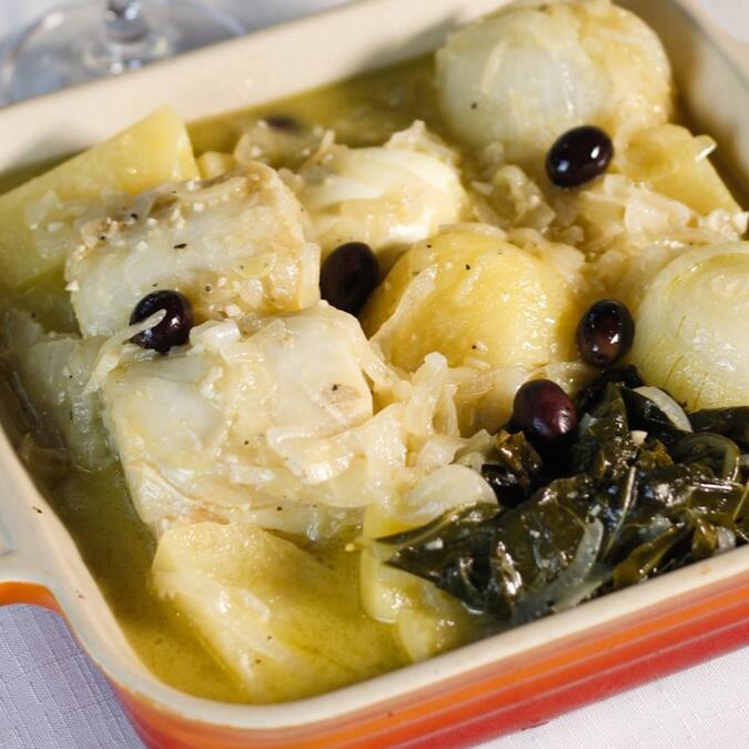 Lombo de bacalhau apurado no azeite, cebolas inteiras, batata, alho. Couve, salsa e ovo.