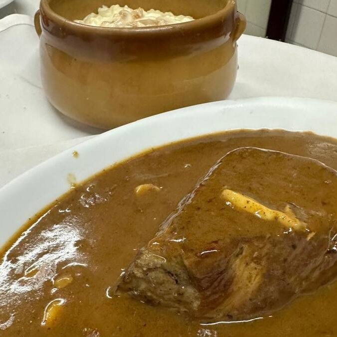 Flambada no conhaque, creme, katchup, polvilhado no queijo, gratinada, batata sauté e arroz.