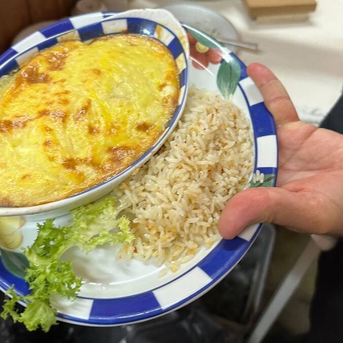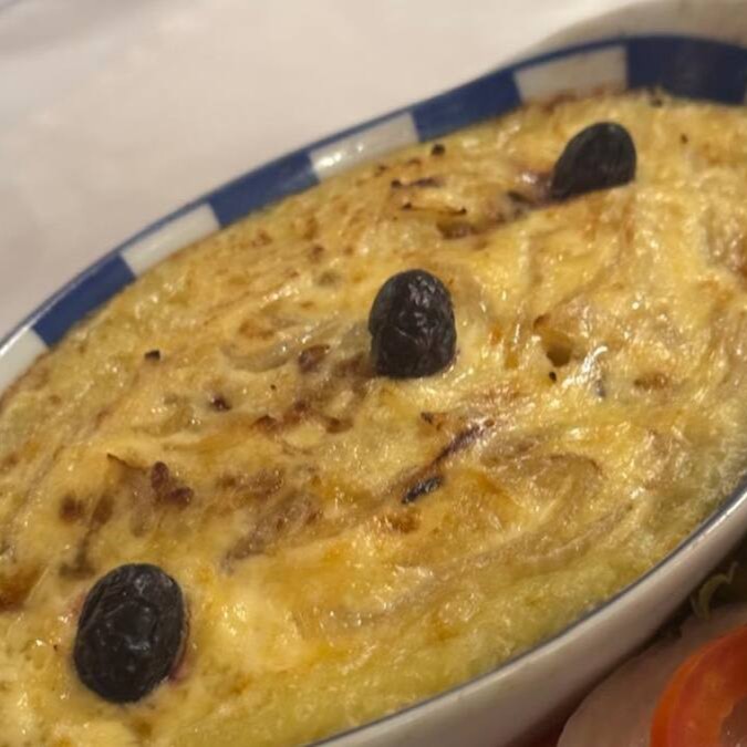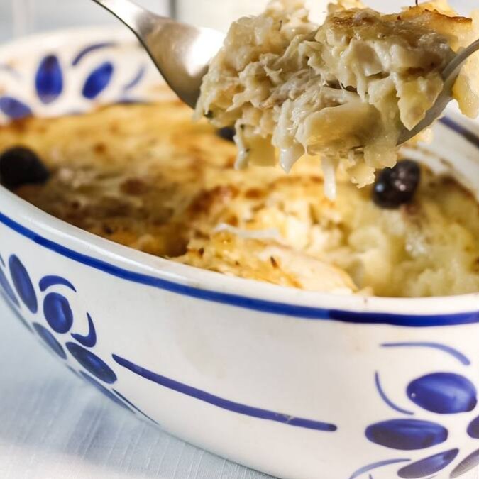 Lascas de bacalhau larga, cebola, azeitonas portuguesas, purê, camada fina de maionese, gratinado.