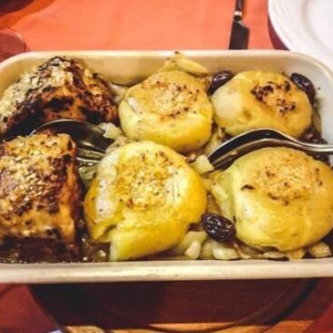Tentáculos de polvo com cebolas, batatas, pimentões, azeite, azeitona portuguesas, ao forno.