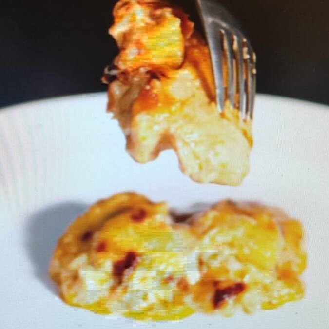 Bacalhau bem desfiado com cebolas, creme, envolvido em natas, batatas, polvilhado com queijo ralado, gratinado.