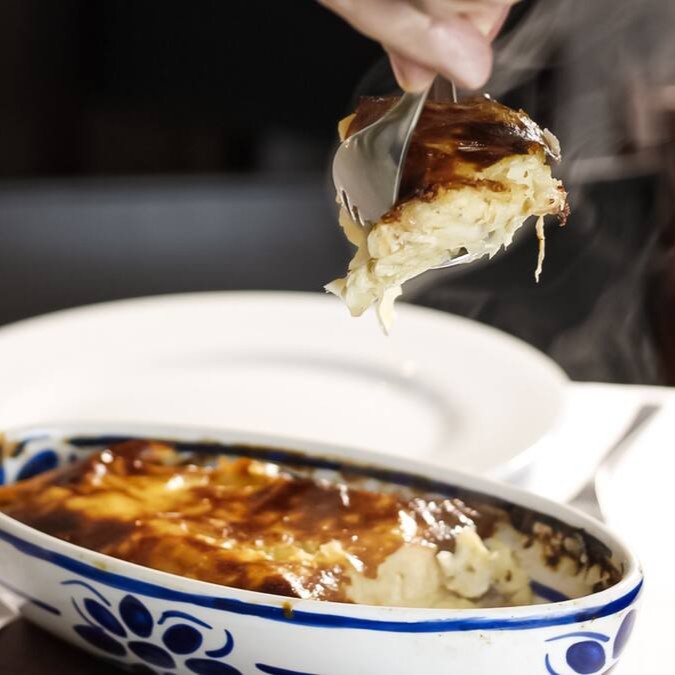 Camadas alternadas de lascas de bacalhau, batatas, azeite,cebolas e ovo cozido ao forno.