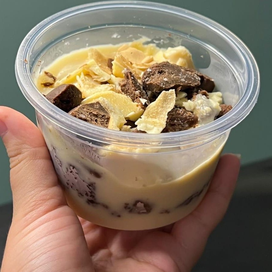 Experimente nosso sofisticado brownie no pote, adornado com uma cobertura de Ouro Branco. Uma combinação perfeita de sabores para um momento especial.