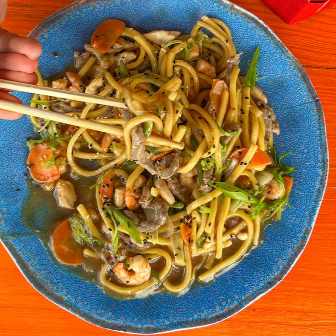 Contém macarrão, legumes, carne, frango e camarão!