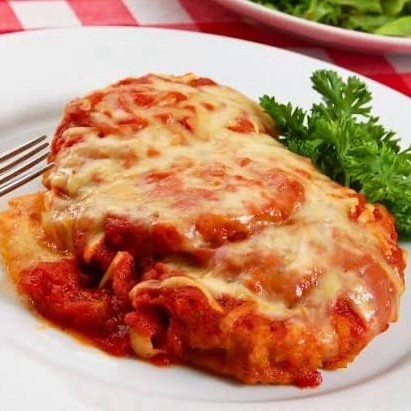 Delicioso Filé de frango a parmegiana para 02 pessoas, acompanha macarrão espaguete ao molho de tomate.