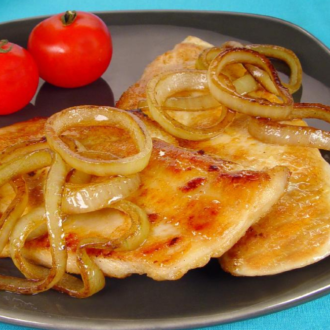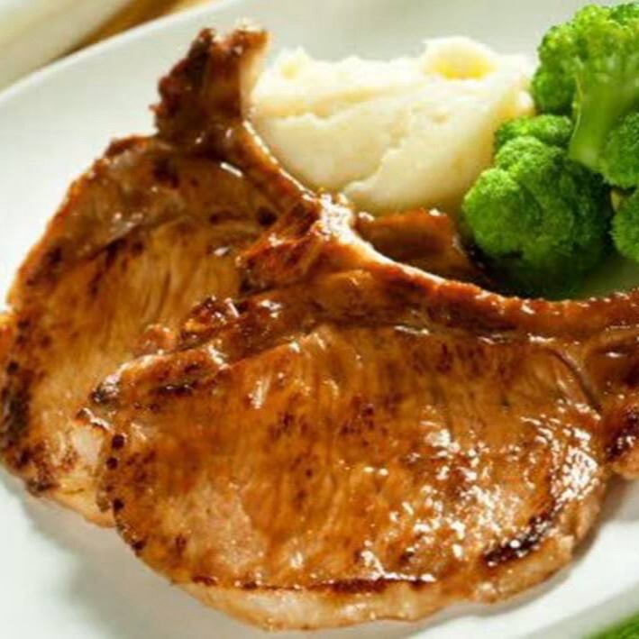 Deliciosa Bisteca Suína assada acebolada onde você pode escolher até 03 acompanhamentos.