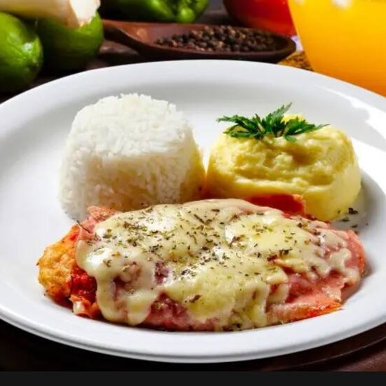 Delicioso filé de frango à parmegiana , escolha entre os complementos : ( 01 Arroz e Purê) ou ( 02 Macarrão e Batata frita) Adicionar na observação.