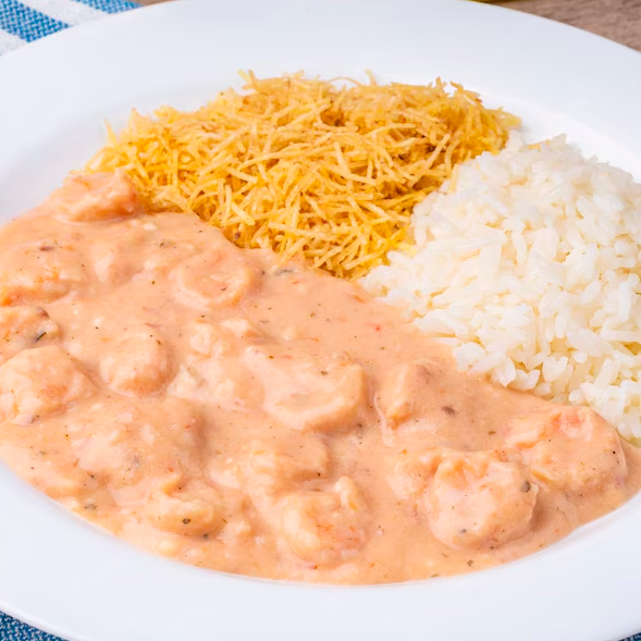 Delicioso estrogonoffe de frango. Acompanha arroz branco e batata palha.